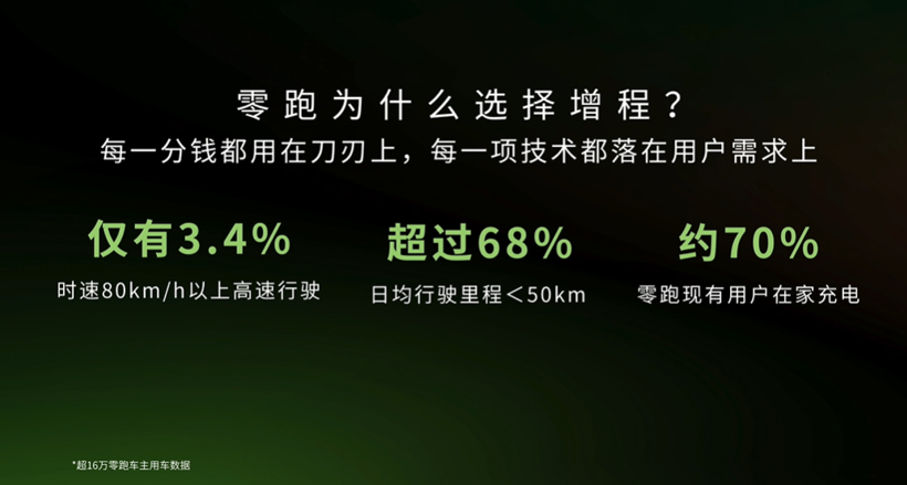 还有一点是,企业自身用户现实需求。零跑汽车调研发现,16 万零跑车主中仅有 3.4% 是高于 80 km/h 行驶的,日均行驶里程小于 50 km 的用户超 68%,且约 70% 的用户有家充。增程式电动车能满足大多用户城市道路用车需求,同时可以帮助用户节省用车成本,还在较大程度上解决了电动汽车续航痛点。