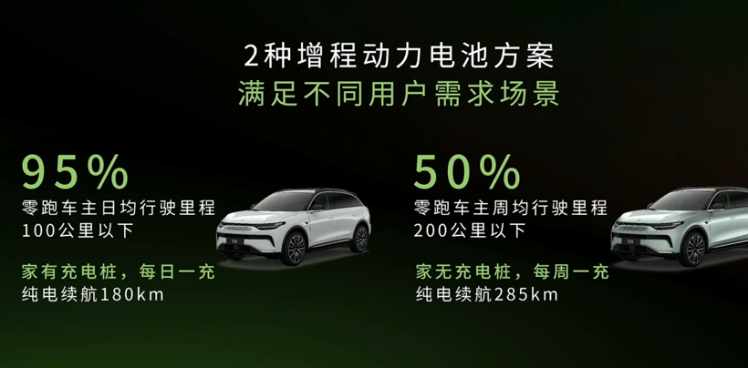 首先,电池方面,C11增程版提供了自研的两种增程动力电池方案。零跑汽车基于对用户累计超20亿公里行驶里程的大数据分析,超过50%的车主周均行驶里程小于200公里,因此,搭载43.74kWh电池包的零跑C11增程,拥有CLTC工况下285km的超长纯电续航,即使不具备家用充电条件,也能够满足用户每周5个工作日的城市纯电通勤。而95%的车主日均行驶里程在100公里以内,搭载30.1kWh容量电池的零跑C11增程,其CLTC纯电续航达到了180km,在家用充电桩的配合下,依旧能够实现城市通勤无忧。