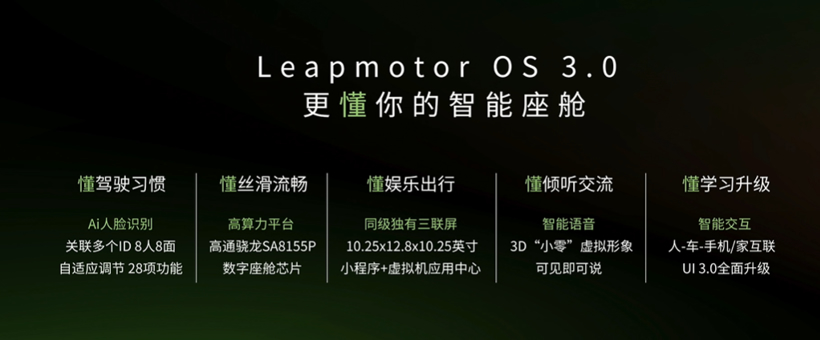 智能座舱方面,零跑C11增程采用Leapmotor OS 3.0智能座舱,基于第三代高通骁龙车规级数字座舱旗舰级平台,搭载科大讯飞3.5代语音交互系统,更智能更人性。