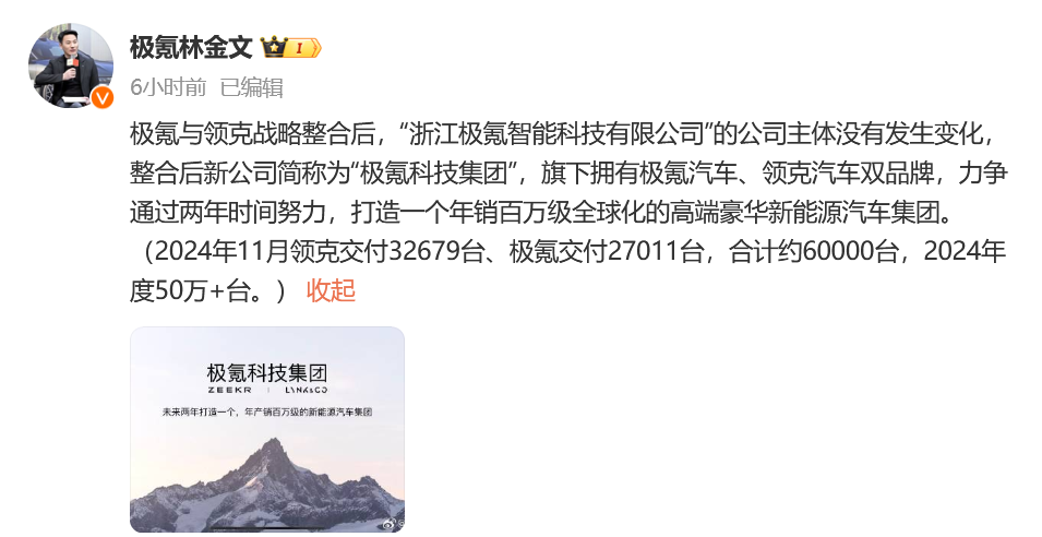 12月3日,极氪智能科技副总裁林金文在微博发文称,极氪与领克战略整合后,“浙江极氪智能科技有限公司”的公司主体没有发生变化,整合后新公司简称为“极氪科技集团”,旗下拥有极氪汽车、领克汽车双品牌,力争通过两年时间努力,打造一个年销百万级全球化的高端豪华新能源汽车集团。
