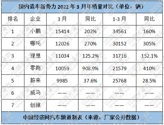数据显示,3月,小鹏、哪吒、理想、零跑和蔚来的销量分别为15414辆、12026辆、11034辆、10059辆、9985辆,同比分别增长202%、270%、125.2%、908.9%、37.6%;第一季度的累计销量分别为34561辆、30152辆、31716辆、21579辆、25768辆,同比分别增长160%、305%、152.1%、410%、28.5%。