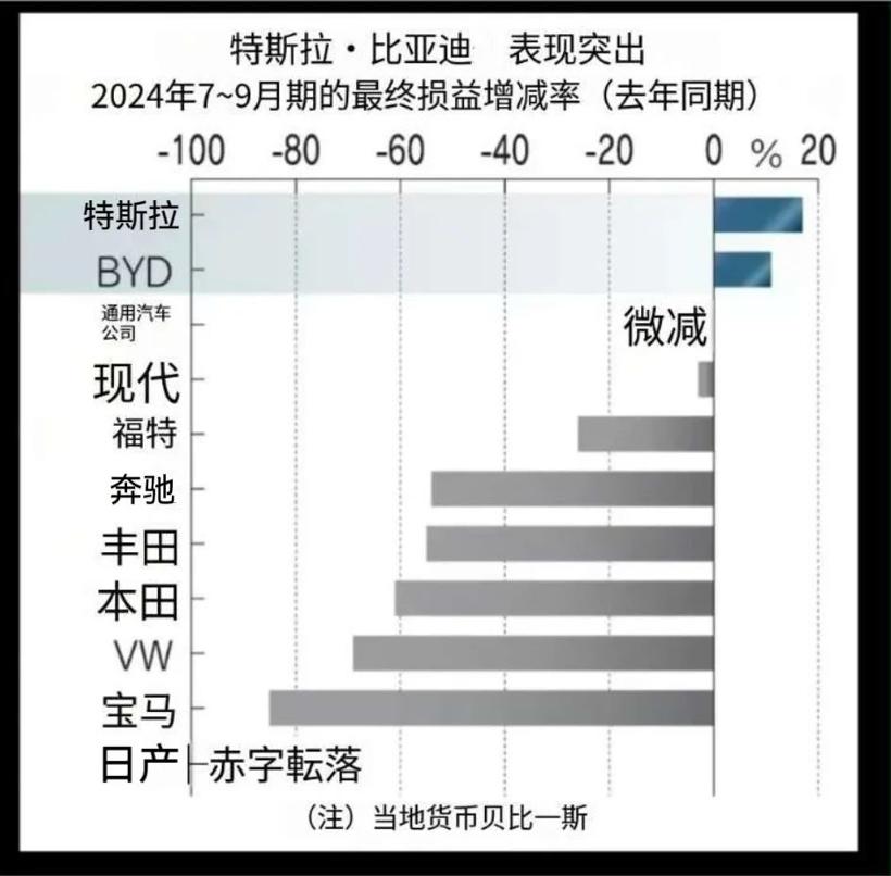 整体来说,全球主要11家车企业绩里,只有特斯拉和比亚迪在7-9月实现利润增长,分别同比提升了17%和11%。此外,丰田利润虽位居榜首,但同比下滑高达55%;日产出现93亿日元的最终亏损,管理层主动降薪;大众、奔驰和宝马等德国制造商也出现了超过50%的利润下滑。