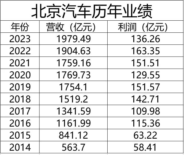 2023年,北京汽车营收1979.49亿元,同比增长3.9%,推动整个北汽集团营收达到4,803亿元,距离2019年的5,012.3亿元相去不远;净利润136.26亿元,同比下滑16.6%。