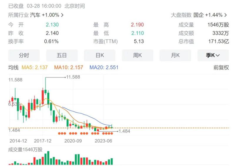 以港股北京汽车股价为观察维度,2014年12月19日上市,发行价8.9元,2017~2018年曾经达到过12.58元的峰值,那也是中国车市国内销量的巅峰岁月。而到2022年底,北京汽车股价一度跌到1.484元谷底,如今也挣扎在2元水平线上。